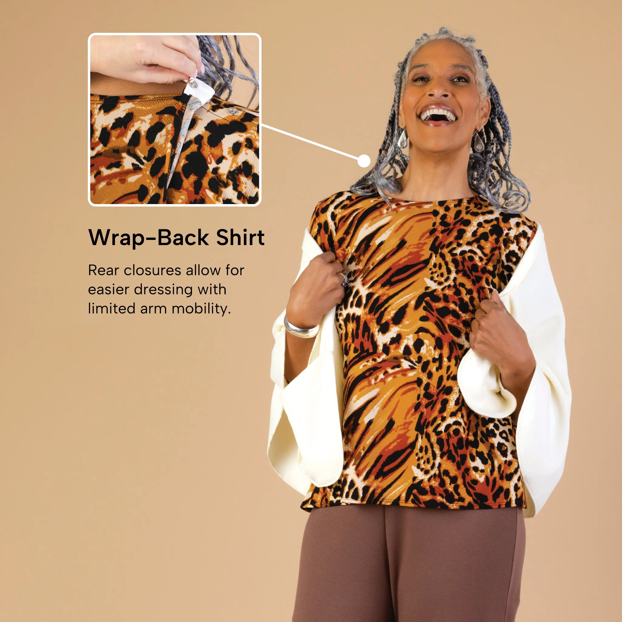 This blouse features an overlapping back closure for easy dressing assistance and pairs seamlessly with our pant styles. The soft poly-spandex blend offers gentle stretch and everyday comfort.