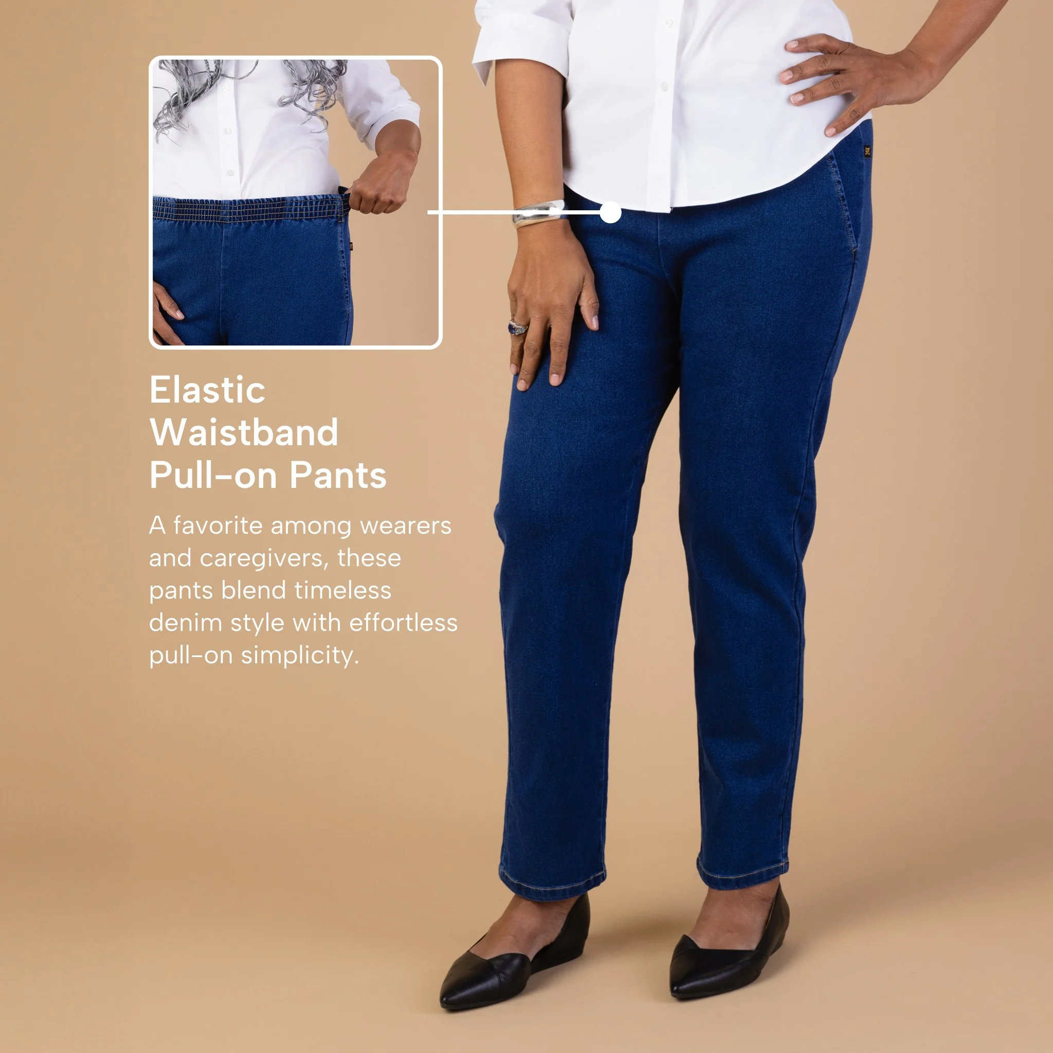 These pull-on denim pants feature an all-elastic waist and side-seam pockets for essentials. Crafted from a cotton/polyester blend with a hint of spandex, they offer a full cut for comfort without restricting the middle.