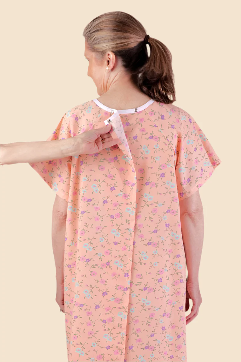 This lightweight cotton/poly nightgown features an adaptive wrap-back design ideal for women who need assisted dressing. Large armholes and a boxy cut make slipping it on simple, while assorted prints add a touch of style.