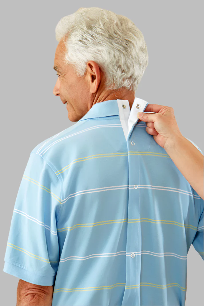 High-quality short sleeve polo shirt adapted for those with limited range of motion. The snap-back design features a full back opening so the shirt can be put on from the front, making dressing easier for the caregiver while maintaining traditional golf shirt styling and comfort.