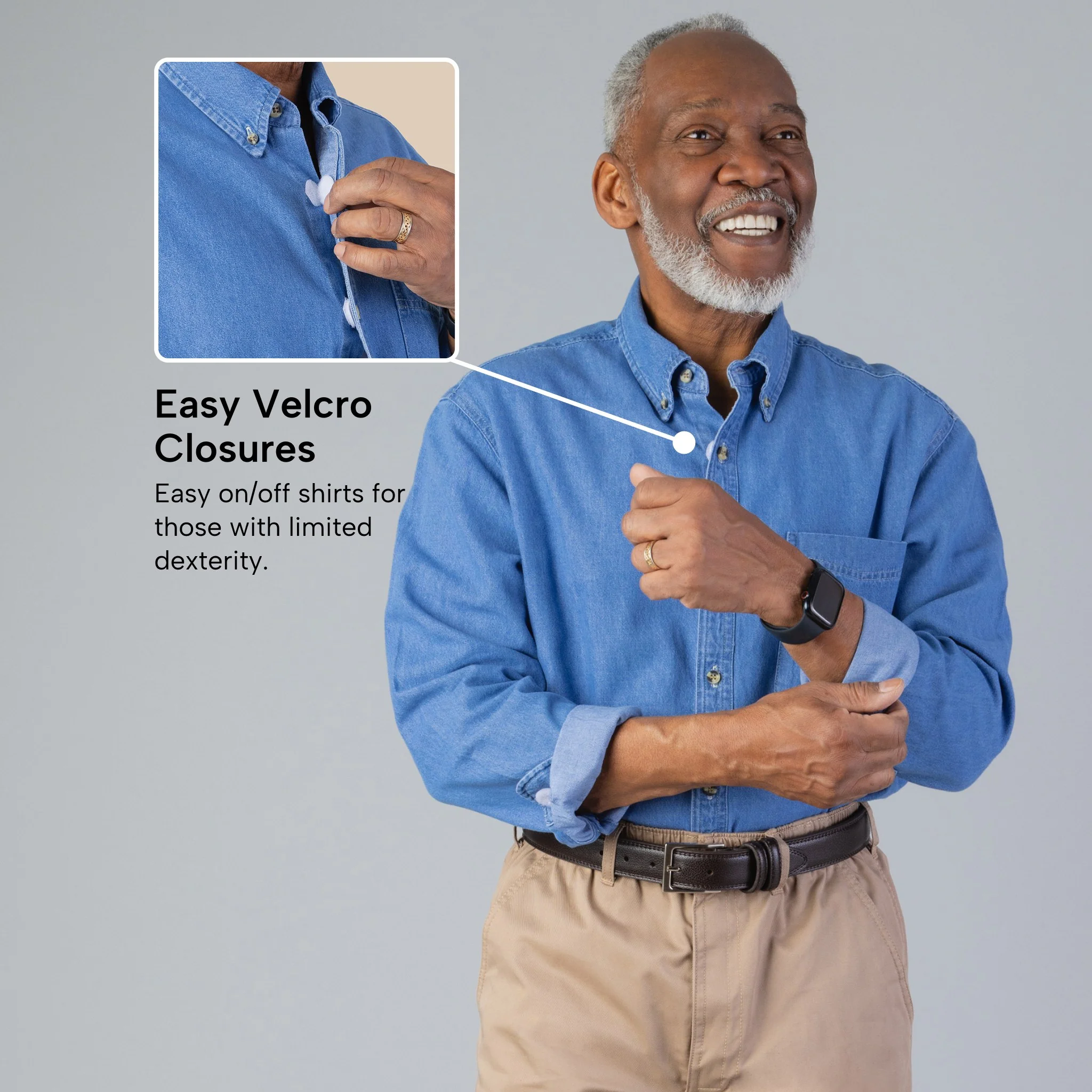 This long sleeve denim shirt features VELCRO® Brand fastener tabs behind the buttons and at the cuffs, allowing men with limited dexterity to dress independently while enjoying a classic, casual look. Soft, pre-washed denim provides comfort, and a generous cut ensures ease of movement. The button-down collar and single chest pocket add traditional styling to a problem-solving design.