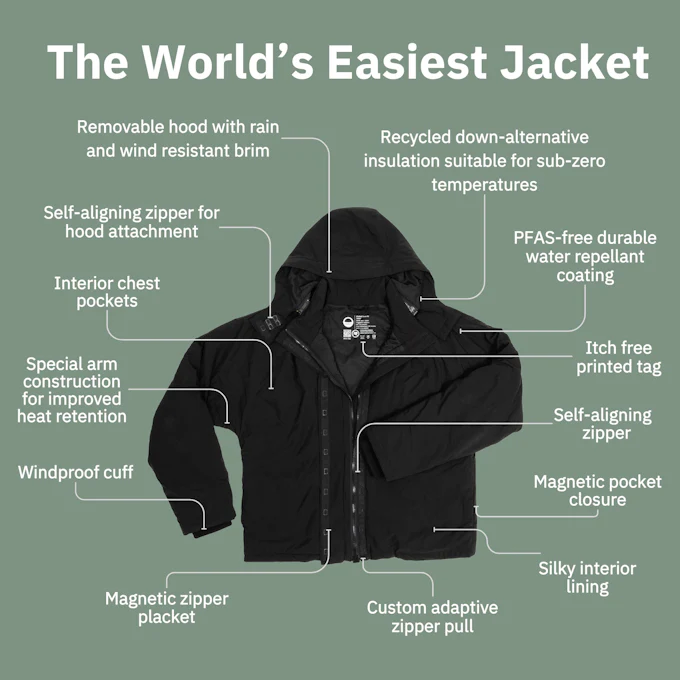 This lightweight, packable jacket pairs a unique self-aligning zipper, its base clicks together and lines up automatically with a flexible magnetic placket for truly hands-free dressing. The custom large loop zipper pull glides up with a single finger or with gloves, and you can even skip the zipper entirely by folding the front closed. A removable hood uses the same self-aligning zipper technology, keeping the experience smooth, soft, and warm for everyday wear.