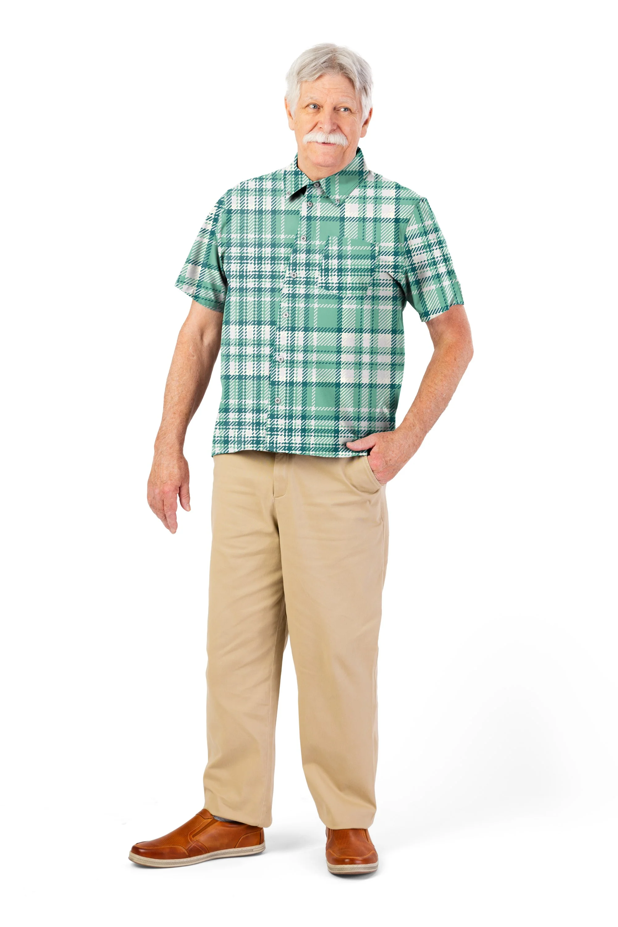 Designed to support independence without sacrificing style, this two-piece set brings together a short sleeve plaid sport shirt and our classic twill pants. The shirt features hidden VELCRO® Brand fasteners that mimic the look of traditional buttons, making it simple for men with limited dexterity to dress with confidence. Made from a stretch woven that is lightweight, stretchy, and comfortable for all day wear. With wrinkle resistant treatment to make laundering easy. The pants complete the set with a secure fastener fly, elastic waistband, and practical pockets, offering a dependable foundation that blends comfort and tradition.
